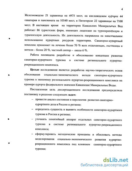 Целью исследования является разработка научно-теоретических основ обоснования социально-экономического вклада санаторно-курортного туризма в экономику регионального курортно-рекреационного комплекса на примере курорта федерального значения Кавказские Минеральные Воды.