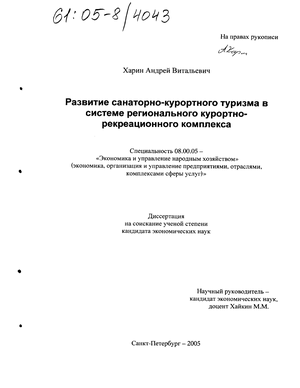 Работа посвящена разработке и обоснованию концепции развития санаторно-курортного туризма в системе регионального курортно-рекреационного комплекса.