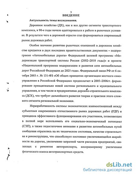 Особое значение развитию рыночных отношений в дорожном хозяйстве придается в двух последних правительственных документах - подпрограмме «Автомобильные дороги» Федеральной целевой программы «Модернизация транспортной системы России (2002-2010 годы)» и проекте «Национальной программы модернизации и развития сети автомобильных дорог Российской Федерации до 2025 года». Федеральный закон РФ от 6 октября 2003 г. № 131-ФЗ «Об общих принципах организации местного самоуправления в Российской Федерации» предполагает в 2005-2006гг. формирование принципиально новой системы регионального и муниципального управления, в том числе и предприятиями дорожно-строительного комплекса (ДСК), что требует дальнейшего развития теории и практики этого сложного сегмента региональной экономики.