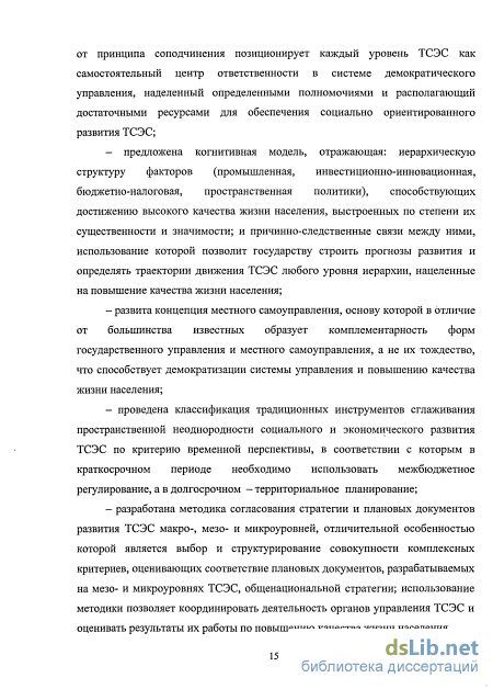 Концепция диссертационной работы. Экономика России представляет собой целостную совокупность многоуровневых территориальных социально-экономических систем, обладающих определенной финансовой и управленческой автономией в системе государственного устройства, развитие которых нацелено на повышение качества жизни населения. Обеспечить более полный учет конкурентных преимуществ и ограничений развития ТСЭС, стимулировать поиск неиспользованного потенциала, рационально размещать производительные силы и углублять экономические и социальные связи необходимо с помощью планирования и регулирования развития ТСЭС разного уровня иерархии по критерию качества жизни населения. Причем стратегический вектор развития определяется на макроуровне. Однако выработка общенациональной стратегии должна осуществляться таким образом, чтобы в условиях самостоятельности каждого уровня управления сочетать общенациональные интересы с интересами ТСЭС на мезо- и микроуровнях, направленными на повышение качества жизни населения. Для предотвращения конфликта интересов между органами власти ТСЭС разного уровня иерархии и оценки эффективности разрабатываемых мероприятий необходимо использовать методику согласования стратегии и плановых документов развития ТСЭС по критерию качества жизни населения. Стимулировать и контролировать достижение запланированных стратегических ориентиров следует с помощью экономических, а не административных инструментов, богатый арсенал которых накоплен в зарубежной практике планирования и регулирования развития ТСЭС. Все это позволит органам власти ТСЭС сохранить самостоятельность в пределах компетенций каждого уровня управления и повысить их ответственность за принимаемые решения, нацеленные на укрепление экономической основы ТСЭС и повышение качества жизни населения.