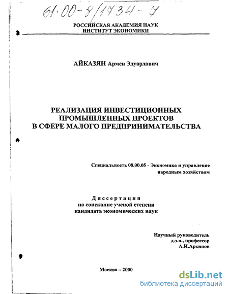 разработать научно обоснованную методику выбора инвестиционных промышленных проектов в сфере малого предпринимательства;