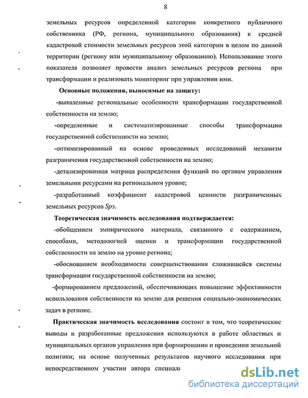 земельных ресурсов определенной категории конкретного публичного собственника (РФ, региона, муниципального образования) к средней кадастровой стоимости земельных ресурсов этой категории в целом по данной территории (региону или муниципальному образованию). Использование этого показателя позволяет провести анализ земельных ресурсов региона при трансформации и реализовать мониторинг при управлении ими. Основные положения, выносимые на защиту: