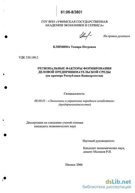 Реализация работы в практической деятельности. Предложенные в работе рекомендации по совершенствованию внешней среды предпринимательства были включены в проект Концепции развития малого предпринимательства в Республике Башкортостан на 2006-2010 гг.