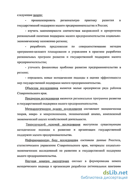 Цель диссертационной работы заключается в разработке инновационных аспектов организации региональных программ развития и государственной поддержки малого предпринимательства.