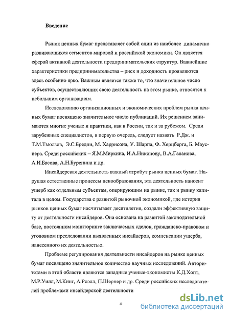 Проблеме регулирования деятельности инсайдеров на рынке ценных бумаг посвящено значительное количество научных исследований. Авторитетами в этой области являются западные ученые-экономисты К.Д.Хопт, М.Р.Уилл, М.Кинг, А.Роэлл, П.Шернер и др. Среди российских исследователей проблемами инсайдерской деятельности в настоящее время занимаются в