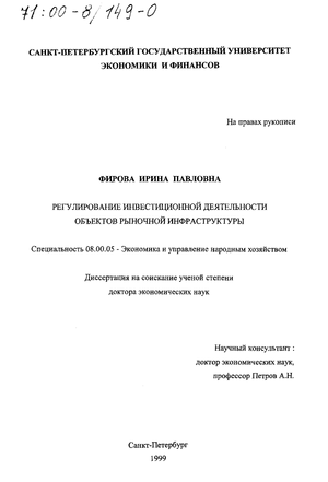 Структура диссертационного исследования включила главы, в которых приведены теоретические обоснования создания и рационального использования системы и механизма регулирования инвестиционной деятельности объектов рыночной инфраструктуры.