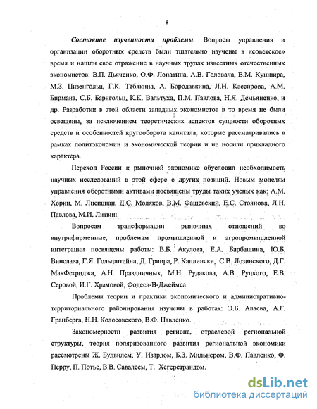 организации оборотных средств были тщательно изучены в «советское» время и нашли свое отражение в научных трудах известных отечественных экономистов: В.П. Дьяченко, О.Ф. Лопатина, А.В. Головача, В.М. Кушнира, М.З. Пизенгольц, Г.К. Тебякина, А. Бородавкина, Л.Н. Кассирова, A.M. Бирмана, СБ. Барнгольц, НА. Жоголева, К.К. Вальтуха, П.М. Павлова, НЛ. Демьяненко, и др. Разработки в этой области западных экономистов в то время не были освещены, за исключением теоретических аспектов сущности оборотных средств и особенностей кругооборота капитала, которые рассматривались в рамках политэкономии и экономической теории и не носили прикладного характера.