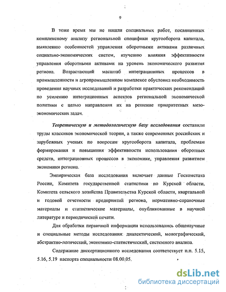 В тоже время мы не нашли специальных работ, посвященных комплексному анализу региональной специфики кругооборота капитала, выявлению особенностей управления оборотными активами различных социально-экономических систем, изучению влияния эффективности управления оборотными активами на. уровень экономического развития региона. Возрастающий масштаб интеграционных процессов в промышленности и агропромышленном комплексе обусловил необходимость проведения научных исследований и разработки практических рекомендаций по усилению интеграционных аспектов региональной экономической политики с целью направления их на решение приоритетных- мезо-экономических задач.