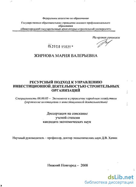 Степень разработанности проблемы. При подготовке диссертационного исследования были использованы работы ведущих российских ученых в сфере управления инвестиционной деятельностью, таких как Азоев Г Л , Асаул А Н, Балабанов И Т , Борзенкова К С , Быстряков А Я, Валевич Р П., Голубков П И, Егоров А Ю , Збрицкий А А, Клепиков ЮН, Ковалев ВВ, Комаров МА, Конотопов MB, Окорокова Л Г, Прыкина Л В , Свободин В А, Серов В М, Смирнов Е Б , Челенков А П , Чистов Л М, Юданов В Г и другие Основной упор в этих работах делается на управлении инвестиционными процессами строительных организаций для адаптации к внешним условиям экономической среды посредством интенсификации производства При этом недостаточно внимания уделяется комплексной оценке инвестиций в создание конкурентных преимуществ на основе использования ресурсного подхода