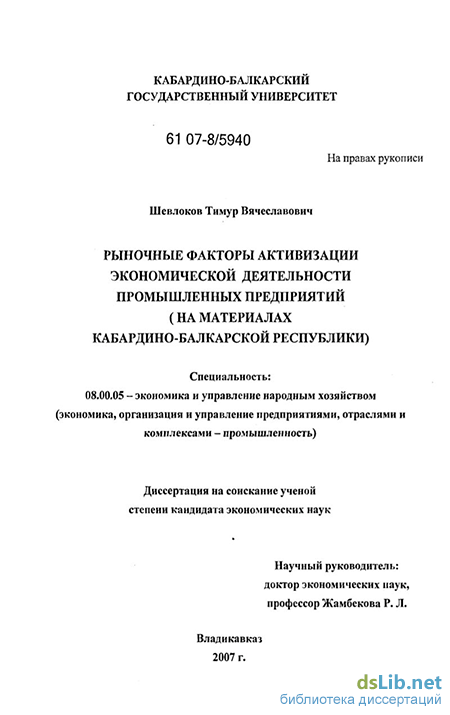 проведен анализ и дана оценка экономического состояния факторов деятельности промышленных предприятий КБР в контексте рыночно-трансформа-ционных требований и возможностей согласования целей и задач управления комплексом;