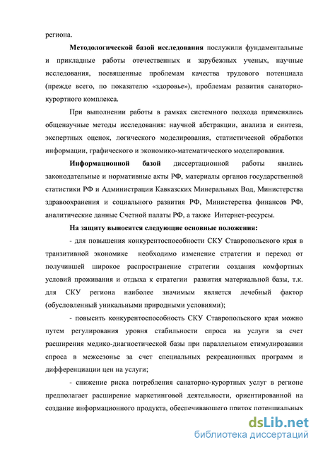 Методологической базой исследования послужили фундаментальные и прикладные работы отечественных и зарубежных ученых, научные исследования, посвященные проблемам качества трудового потенциала (прежде всего, по показателю «здоровье»), проблемам развития санаторно-курортного комплекса.