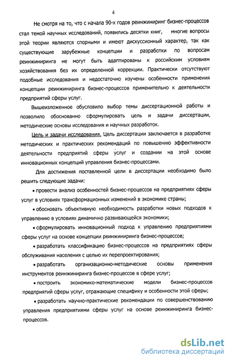 Не смотря на то, что с начала 90-х годов реинжиниринг бизнес-процессов стал темой научных исследований, появились десятки книг, многие вопросы этой теории являются спорными и имеют дискуссионный характер, так как существующие зарубежные концепции и разработки по вопросам реинжиниринга не могут быть адаптированы к российским условиям хозяйствования без их определенной коррекции. Практически отсутствуют подобные исследования и недостаточно изучены особенности применения концепции реинжиниринга бизнес-процессов применительно к деятельности предприятий сферы услуг.