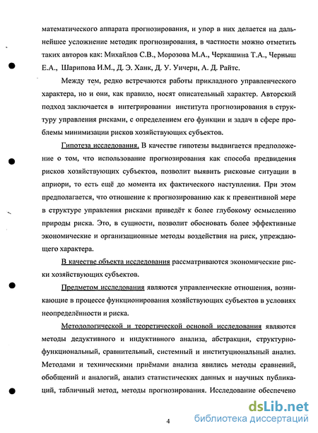 Степень разработанности темы исследования. Вопросы, связанные с рассмотрением таких понятий как "риск" и "неопределённость" исследовались такими учёными как: Абчук В.А., Завьялов Ф.Н., И. Тюнен, Качалов P.M., Клейнер Г.Б., Малашихина Н.Н., Р. Мертон, Ф. Найт, Сечкарёв Г.И., Скаржинский М.И., Ж.Б. Сей, Ступаков B.C., Травин Г.М., М. Шоулз, У. Шумпетер, Фомичёв А.Н., Чекмарёв В.В., Шапкин А.С. Однако, как правило, вышеназванные авторы сосредотачиваются на рассмотрении понятий "неопределённость" и "риск", проблеме анализа, классификации, управления различного рода рисками, на практических рекомендациях по управлению рисками в той или иной сфере народного хозяйства. Существует также множество работ в области прогнозирования, таких авторов как: Багриновский К.А., Басовский Л.Е., Владимирова Л.П., Голубков Е.П., Демидов С.Ф., Кан-даурова Г.А., Кладышев А.Н. Большинство из них посвящено рассмотрению