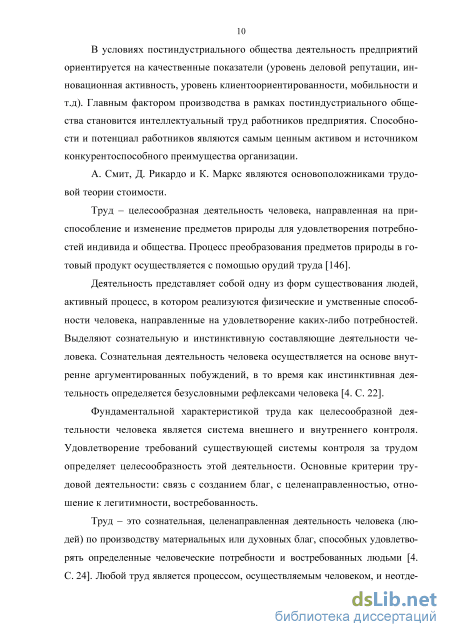 Полученные в диссертации результаты позволяют сделать следующие выводы: 1. В рамках перехода в информационное общество интеллектуальный труд является главным движущим элементом в развитии экономики и общества. 2. Развитие информационно-коммуникационных технологий определяет новые требования к компетенциям интеллектуального работника. Внедрение новых программных продуктов на предприятии также способствует новым формам коммуникации и передачи знаний. Создание системы управления знаниями является важным, а порой и необходимым компонентом развития компании. 3. Изучение современных исследований, посвященных характеристикам репродуктивного (регламентированного) и интеллектуального труда, позволило предложить авторское определение интеллектуального труда. Интеллектуальный труд – процесс преобразования в результате творческой деятельности имеющихся у человека знаний, умений, компетенций, а также внешней информации в материализованные знания и интеллектуальные про 146 дукты в рамках кругооборота «личностные знания кодифицированные знания компетентностные знания материализованные знания». 4. Интеллектуальный труд представляет собой особый вид трудовой деятельности, имеющий в качестве своей основы творческий вид умственной деятельности и физический труд. 5. Для создания в организации благоприятных условий для долговременного, качественного и эффективного интеллектуального труда необходимо учитывать специфические характеристики творческой личности. 6. Система мотивации интеллектуальных работников должна основываться на создании условий для удовлетворения потребностей творческой, культурной и духовной личности. К таким потребностям можно отнести социальные альтруистические, интеллектуальные, эстетические и духовные потребности достижения целей жизни. 7. Система мотивации современного предприятия должна основываться на принципах равенства, уважения и условий труда. Создание системы мотивации, направленной на патриотический, хозяйственный и профессиональный тип мотивации, с использованием таких форм стимулирования как участие в управлении, патернализм, натуральные, организационные, моральные, карьера и развитие, позволит повысить эффективность использования интеллектуального потенциала сотрудников предприятия. 8. Для активизации творческого процесса на предприятии необходимо создать ряд условий. Организация интеллектуального труда должна включать такие обязательные элементы как управление ресурсом интеллектуального труда, создание необходимой основы для процесса интеллектуального труда, управление самим процессом интеллектуального труда и оценка результата интеллектуального труда. Таким образом, по нашему мнению, организация интеллектуального труда состоит из следующих элементов: «Ресурс», «Основа», «Процесс» и «Результат». 9. Система организации интеллектуальным трудом в контексте про блемы трансформации знаний может быть рассмотрена с точки зрения це почки создания нового знания. Элемент организации интеллектуального тру 147 да «Ресурс» способствует созданию личностных знаний. Элемент организации «Основа» позволяет кодифицировать знания в символах и знаках. Элемент организации интеллектуального труда «Процесс» позволяет использовать знания для повышения компетенций ин