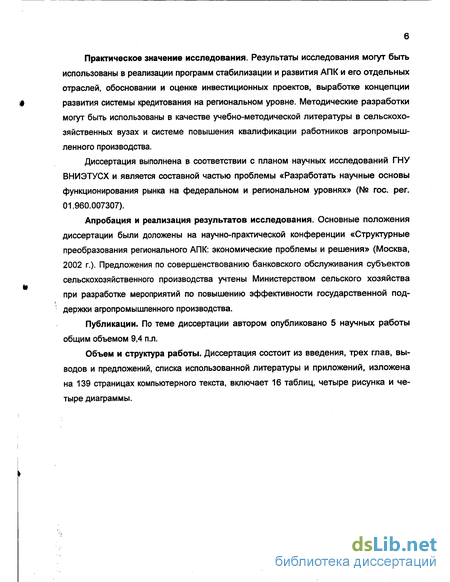 • обоснованы предложения по организации инвестиционного кредитования и его инфраструктуры с применением ипотечного механизма и финансовых инструментов фондового рынка. Практическое значение исследования. Результаты исследования могут быть использованы в реализации программ стабилизации и развития АПК и его отдельных отраслей, обосновании и оценке инвестиционных проектов, выработке концепции развития системы кредитования на региональном уровне. Методические разработки могут быть использованы в качестве учебно-методической литературы в сельскохозяйственных вузах и системе повышения квалификации работников агропромышленного производства.