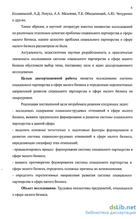 Целью диссертационной работы является исследование системы социального партнерства в сфере малого бизнеса и определение перспективных направлений развития социального партнерства в сфере малого бизнеса на микроуровне.