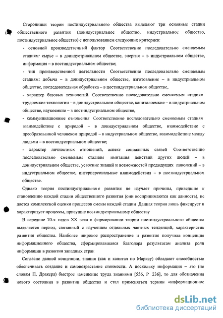 Актуальность гемы исследования. Процессы, происходящие в настоящее время в России, сопровождаемые падением жизненного уровня населения, имущественным расслоением общества, обострением социальной напряженности в стране в целом, несут в себе серьезную угрозу социально-экономическому развитию и обусловливают необходимость использования принципиально новых подходов в управлении общественным развитием Определение достижимых целей функционирования экономики и общества, выбор оптимальных путей их достижения во многом зависит не только от изучения проблем современного развития России, но и от выявления общемировых тенденций В связи с этим нельзя обойти вниманием вопрос, связанный с тем, какое же общество и экономика придут на смену современным Учеными различных стран на протяжении длительного времени предпринимаются попытки поиска ответа на данный вопрос Однако однозначного, бесспорного ответа пока не найдено Обоснование общемировой тенденции общественного развития позволит конкретным странам (с учетом собственного и зарубежного опыта) усовершенствовать механизм государственного регулирования, позволяющий создать необходимые условия для жизнедеятельности как общества в целом, так и отдельного человека