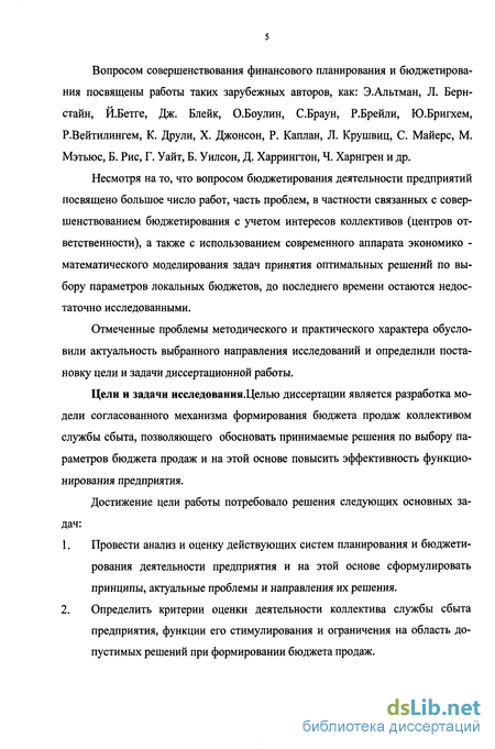 Цели и задачи исследования.Целью диссертации является разработка модели согласованного механизма формирования бюджета продаж коллективом службы сбыта, позволяющего обосновать принимаемые решения по выбору параметров бюджета продаж и на этой основе повысить эффективность функционирования предприятия.
