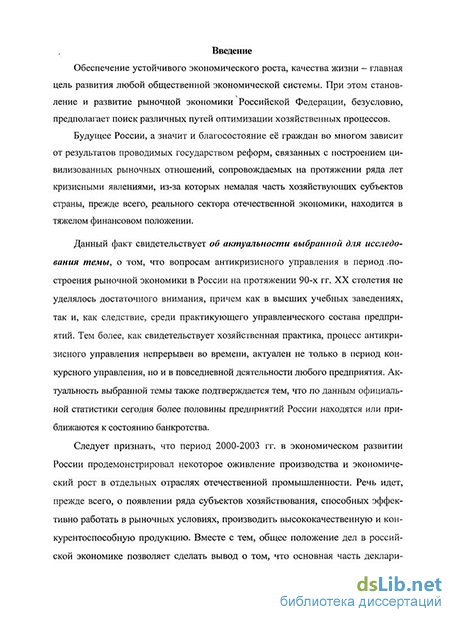 Будущее России, а значит и благосостояние её граждан во многом зависит от результатов проводимых государством реформ, связанных с построением цивилизованных рыночных отношений, сопровождаемых на протяжении ряда лет кризисными явлениями, из-за которых немалая часть хозяйствующих субъектов страны, прежде всего, реального сектора отечественной экономики, находится в тяжелом финансовом положении.