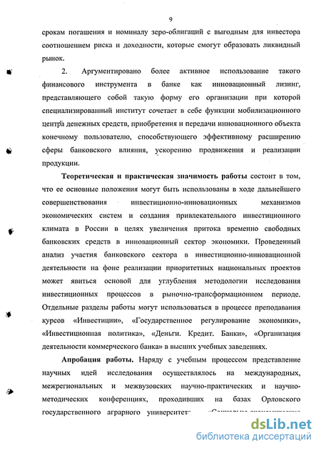 экономических систем и создания привлекательного инвестиционного климата в России в целях увеличения притока временно свободных банковских средств в инновационный сектор экономики. Проведенный анализ участия банковского сектора в инвестиционно-инновационной деятельности на фоне реализации приоритетных национальных проектов может явиться основой для углубления методологии исследования инвестиционных процессов в рыночно-трансформационном периоде. Отдельные разделы работы могут использоваться в процессе преподавания курсов «Инвестиции», «Государственное регулирование экономики», «Инвестиционная политика», «Деньги. Кредит. Банки», «Организация деятельности коммерческого банка» в высших учебных заведениях.
