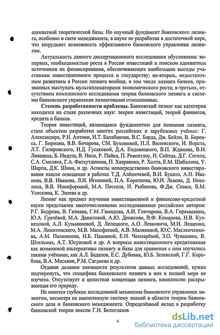 Отдавая должное значимости результатов данных исследований, нужно подчеркнуть, что специфика банковского лизинга в них в полной мере не изучена. Отсутствует и целостная концепция лизинга, комплексно раскрывающая его природу.