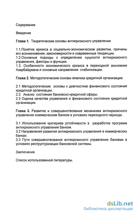 СТРУКТУРА ДИССЕРТАЦИИ. Введение. Глава 1. Теоретические основы антикризисного управления. 1.1.Понятие кризиса в социально-экономическом развитии, причины его возникновения, закономерности и современные тенденции. 1.2.0сновные подходы к определению сущности антикризисного управления, факторы и функции. 1.3. Особенности экономического кризиса в переходной экономике Азербайджана и основные направления стабилизации. Глава 2. Методологические основы анализа кредитной организации. 2.1. Методологические подходы к диагностике финансового состояния кредитной организации. 2.2. Анализ состояния банковско-кредитной сферы. 2.3. Оценка качества управления и финансового состояния кредитной организации. Глава 3. Развитие и совершенствование механизма антикризисного управления коммерческим банком в условиях переходного периода. 3.1. Использование критериев устойчивости в разработке программ антикризисного управления банком. 3.2. Направления развития антикризисного управления в коммерческих банках. 3.3. Пути совершенствования антикризисного управления банками в условиях реструктуризации банковской системы. Заключение.