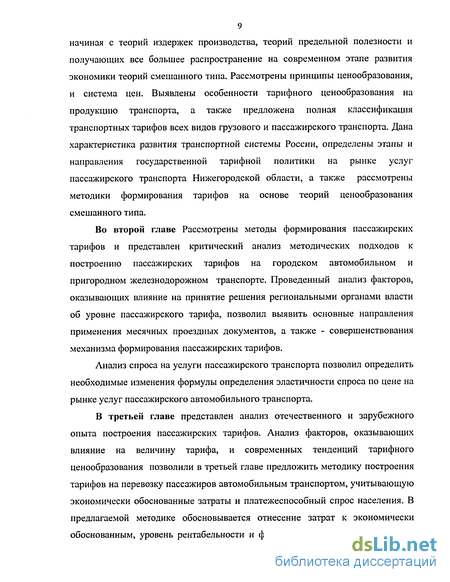 В первой, главе рассмотрена методология ценообразования, проанализированы теории ценообразования в своем историческом развитии, начиная с теорий издержек производства, теорий предельной полезности и получающих все большее распространение на современном этапе развития экономики теорий смешанного типа. Рассмотрены принципы ценообразования, и система цен. Выявлены особенности тарифного ценообразования на продукцию транспорта, а также предложена полная классификация транспортных тарифов всех видов грузового и пассажирского транспорта. Дана характеристика развития транспортной системы России, определены этапы и направления государственной тарифной политики на рынке услуг пассажирского транспорта Нижегородской области, а также рассмотрены методики формирования тарифов на основе теорий ценообразования смешанного типа.