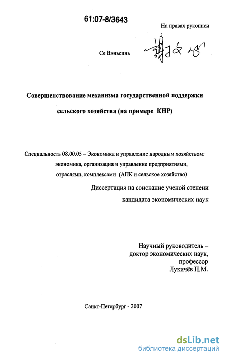 Состояние изученности проблемы. Учитывая важность проблемы, многие китайские и зарубежные учёные экономисты: Лю Гогуан, Мао Тяньци, У Цзинлянь, Ху Аньган, Хуан Дингуй, Чи Фулинь, Sun Liping, Zhao Yaohui, Zhou Wei, Бергер Я., Гельбрас В., Кранина Е., Пивоварова Э.П., Устиян И., D.Gale Johnson - посвятили свои исследования формированию и совершенствованию механизма государственного регулирования сельского хозяйства КНР, оценивая возможности использования опыта как стран с переходной экономикой, так и развитых стран. Особо хотелось бы отметить диссертационное исследование Го Тяньхао, которое было посвящено особенностям формирования рыночных в аграрном секторе КНР до середины 1990-х годов. Тем не менее, новые экономические условия третьего тысячелетия, вступление во Всемирную Торговую Организацию и необходимость перевода сельскохозяйственного производства на интенсивный путь развития обуславливают необходимость качественного совершенствования механизма государственной поддержки сельского хозяйства Китая.