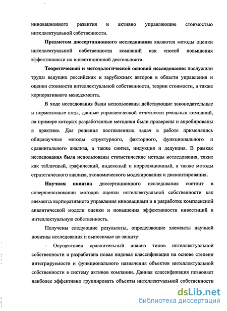 Предметом диссертационного исследования являются методы оценки интеллектуальной собственности компаний как способ повышения эффективности их инвестиционной деятельности.