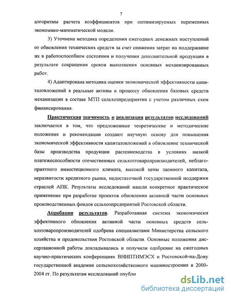 Практическая значимость и реализация результатов исследований заключается в том, что предложенные теоретические и методические положения и рекомендации создают научную основу для повышения экономической эффективности капиталовложений в обновление технической базы производства продукции растениеводства в условиях низкой платежеспособности отечественных сельхозтоваропроизводителей, неблагоприятного инвестиционного климата, высокой цены заемного капитала, неразвитости кредитного рынка, недостаточной государственной поддержки отраслей АПК. Результаты исследований нашли конкретное практическое применение при разработке проектов обновления активной части основных производственных фондов сельхозпредприятий Ростовской области.