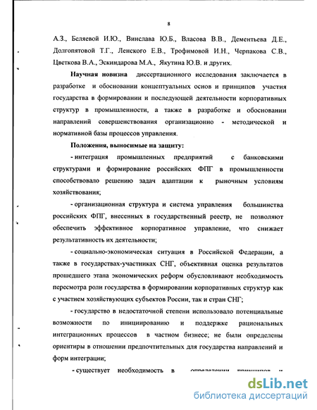 Научная новизна диссертационного исследования заключается в разработке и обосновании концептуальных основ и принципов участия государства в формировании и последующей деятельности корпоративных структур в промышленности, а также в разработке и обосновании направлений совершенствования организационно - методической и нормативной базы процессов управления.