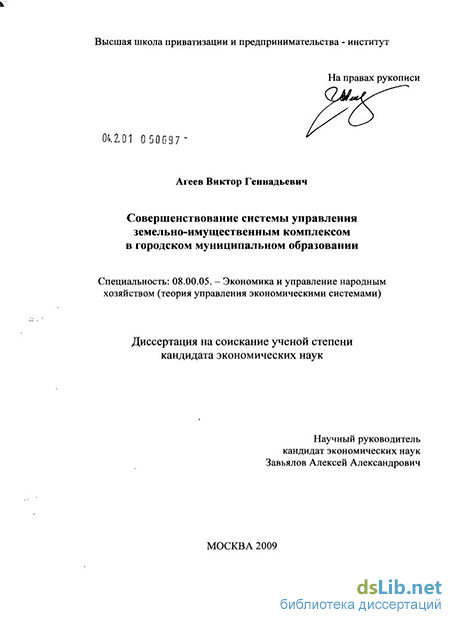 Предметом диссертационного исследования являются отношения, возникающие между органами государственной власти, органами местного самоуправления, юридическими и физическими лицами, в системе управления земельно-имущественным комплексом городского муниципального образования.