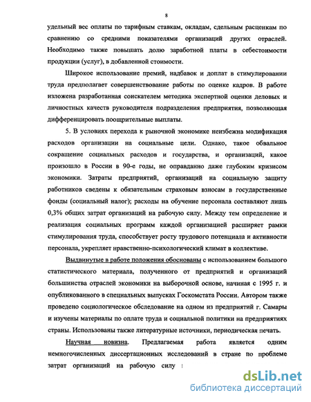 Научная новизна. Предлагаемая работа является одним немногочисленных диссертационных исследований в стране по проблеме затрат организаций на рабочую силу и значения их структуры для