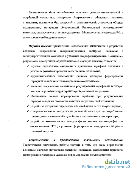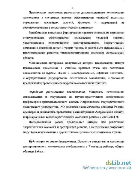 Теоретическая и практическая значимость исследования. Теоретическая значимость работы состоит в том, что даны определения основным научным категориям тарифной политики, разработаны принципы формирования тарифов в условиях реформирования теплоэнергетики.