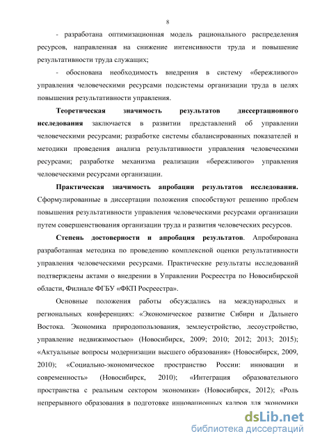 результативности управления человеческими ресурсами. Практические результаты исследований подтверждены актами о внедрении в Управлении Росреестра по Новосибирской области, Филиале ФГБУ «ФКП Росреестра». Основные положения работы обсуждались на международных и региональных конференциях.