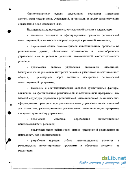 4 В соответствии с этим в работе поставлены и решаются следующие задачи: - исследована сущность инвестиций, инвестиционной деятельности в условиях рыночной экономики; проанализированы проблемы и закономерности развития инвестиционных процессов в условиях становления рыночной экономики, определены возможности управления ими на региональном уровне с учетом расширения прав и экономической самостоятельности регионов; рассмотрены особенности формирования регионального рынка инвестиций и основные факторы инвестиционной привлекательности территорий в новом их управленческом качестве; исследованы теоретические предпосылки, факторы и специфика построения региональной инвестиционной программы, как основы целенаправленного управления инвестиционной деятельностью в регионе; применительно к региональной инвестиционной программе разработаны методы оценки финансового состояния и отбора предприятий-реципиентов; рассмотрены основные методологические принципы оценки и отбора инвестиционных проектов для включения в региональную инвестиционную программу; разработаны методические рекомендации по мониторингу региональной инвестиционной программы, принципы и формы участия в ее реализации региональных органов.
