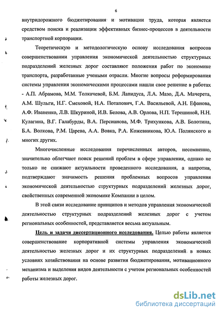 На железнодорожном транспорте известными учеными проводилась большая работа по разработке и внедрению системы управления хозяйственным механизмом железных дорог. Однако в настоящее время при развитии рыночных методов хозяйствования в отрасли необходимо совершенствование системы внутридорожного бюджетирования и мотивации труда, которая является средством поиска и реализации эффективных бизнес-процессов в деятельности 1 транспортной корпорации. Теоретическую и методологическую основу исследования вопросов V совершенствовании управления экономической деятельностью структурных подразделений железных дорог составляют положения работ по экономике транспорта, разработанные учеными отрасли. Многие вопросы реформирования системы управления экономическими процессами нашли свое решение в работах - А.П. Абрамова, М.М. Толкачевой, Б.М. Лапидуса, Л.А. Мазо, Д.А. Мачерета, A.M. Шульги, Н.Г. Смеховой, Н.А. Потапович, Г.А. Васильевой, А.Н. Ефанова, А.Ф. Иваненко, Л.В. Шкуриной, И.В. Белова, А.В. Орлова, Н.П. Терешиной, Н.Н. Кулагина, В.Г. Галабурды, В.А. Персианова, М.Ф. Трихункова, А.В. Болотина, Б.А. Волкова, P.M. Царева, А.А. Вовка, Р.А. Кожевникова, Ю.А. Полянского и f, многих других.