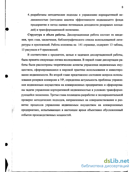 В соответствии с предметом, целью и задачами диссертационной работы, была принята следующая логика исследования. В первой главе диссертации работы были рассмотрены теоретические аспекты управления недвижимым имуществом, сформировавшиеся в мировой практике использования и инвестирования недвижимости. Во второй главе представлено состояние вопроса использования резервов конверсии в УР, определена актуальность проблемы управления недвижимым имуществом на конверсионных предприятиях и сформированы задачи управления корпоративной недвижимостью в условиях трансформирующейся экономики. Третья глава посвящена разработке и экспериментальной проверке методических подходов, направленных на совершенствование и развитие процессов управления недвижимым имуществом на конверсионных предприятиях, испытывающих в настоящее время объективно обусловленный избыток производственных мощностей.
