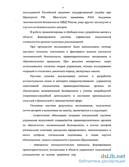 Основные научные результаты исследования, полученные лично автором и выносимые на защиту, заключаются в следующем: теоретически обосновано создание специальной системы управления подготовкой специалистов правоохранительных органов по обеспечению экономической безопасности, в основе которой оптимальное сочетание дисциплин юридического, экономического и иного профиля, специальная подготовка, а также научно обоснованные модели специалиста с высшим образованием; определены методологические принципы формирования правоохранительных механизмов в области управления подготовкой специалистов на основе анкетного опроса и экспертной оценки
