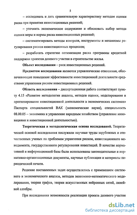 Теоретическая и методологическая основа исследований. Теоретической основой исследования послужили научные труды зарубежных и отечественных ученых по проблемам управления риском, инвестиционного менеджмента, государственного регулирования инвестиций В качестве нормативной и информационной базы были использованы законодательные и нормативно-организационные документы, научные публикации и материалы периодической печати