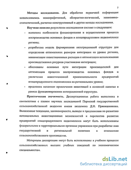 7 Методы исследования. Для обработки первичной информации использовались монографический, абстрактно-логический, экономико-статистический, расчетно-конструктивный и другие методы исследования. Научная новизна результатов исследования состоит в следующем: выявлены особенности финансирования и осуществления процесса воспроизводства основных фондов в птицепродуктовом подкомплексе региона; разработана модель формирования интеграционной структуры для определения оптимальных размеров интеграции на уровне региона, минимизации инвестиционных расходов и оптимизации использования производственных ресурсов участниками интеграции; обоснованы основные пути интеграции производителей для оптимизации процесса воспроизводства основных фондов и увеличения инвестиционной привлекательности предприятий птицепродуктового подкомплекса на региональном уровне; предложен механизм привлечения инвестиций в основной капитал в рамках функционирования интеграционной структуры.