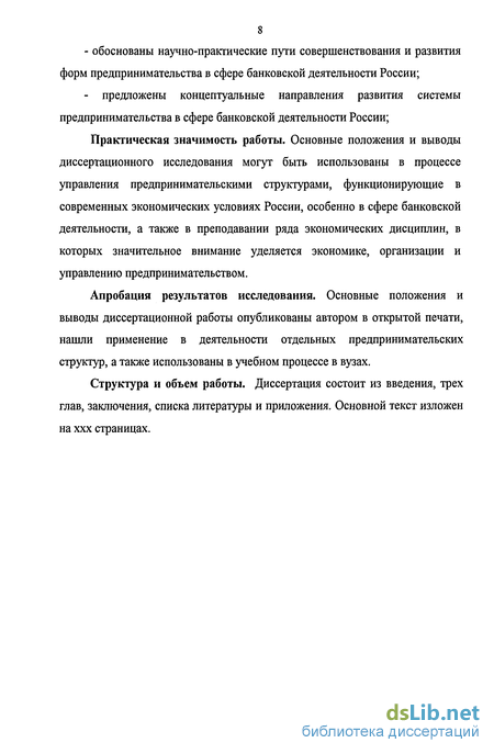 Практическая значимость работы. Основные положения и выводы диссертационного исследования могут быть использованы в процессе управления предпринимательскими структурами, функционирующие в современных экономических условиях России, особенно в сфере банковской деятельности, а также в преподавании ряда экономических дисциплин, в которых значительное внимание уделяется экономике, организации и управлению предпринимательством.