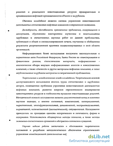 Теоретическая и методологическая основа исследования. Теоретической основой диссертационного исследования явились труды отечественных и зарубежных авторов, посвященные проблемам управления инвестиционной деятельностью нефтяных компаний, развития вопросов стратегического планирования инвестиционных ресурсов и особенностям принятия инвестиционных решений. Методической основой исследования является диалектический метод и основные научные подходы,, а именно системный, комплексный, интеграционный, маркетинговый, многофункциональный,, динамический,- воспроизводственный, нормативный, количественный (математический), ситуационный. Исследование проводилось на принципах единства исторического и логического, формы и содержания. Использовались общенаучные методы познания, а также методы экономико-статистических сравнений и абстрактно-логических суждений.