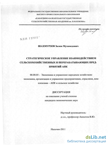 Работа выполнена в соответствии с планом научных исследований ФГОУ ВПО «Кабардино-Балкарская государственная сельскохозяйственная академия» по теме «Организационно-экономические отношения в региональном АПК».