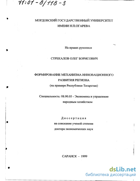 Предмет и объект исследования. Предметом исследования является совокупность теоретических и методологических проблем формирования механизма инновационного типа развития и использования методов государственного регулирования инновационного развития региона в условиях рыночных отношений.