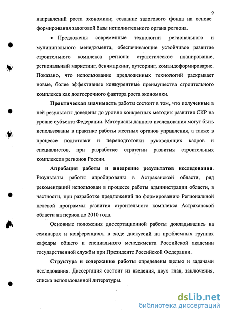Апробация работы и внедрение результатов исследования. Результаты работы апробированы в Астраханской области, ряд рекомендаций использован в процессе работы администрации области, в частности, при разработке предложений по формированию Региональной целевой программы развития строительного комплекса Астраханской области на период до 2010 года.