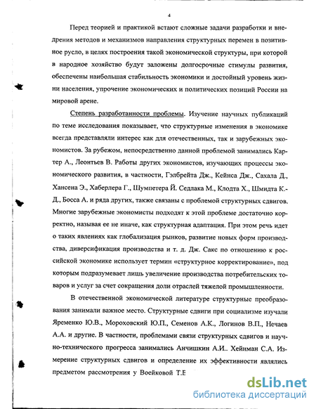 Степень разработанности проблемы. Изучение научных публикаций по теме исследования показывает, что структурные изменения в экономике всегда представляли интерес как для отечественных, так и зарубежных экономистов. За рубежом, непосредственно данной проблемой занимались Картер А., Леонтьев В. Работы других экономистов, изучающих процессы экономического развития, в частности, Гэлбрейта Дж., Кейнса Дж., Сахала Д., Хансена Э., Хаберлера Г., Шумпетера Й. Седлака М., Клодта X., Шмидта К.-Д., Босса А. и ряда других, также связаны с проблемой структурных сдвигов. Многие зарубежные экономисты подходят к этой проблеме достаточно корректно, называя ее не иначе, как структурная адаптация. При этом речь идет о таких явлениях как глобализация рынков, развитие новых форм производства, диверсификация производства и т. д. Дж. Сакс по отношению к российской экономике использует термин «структурное корректирование», под которым подразумевает лишь увеличение производства потребительских товаров и услуг за счет сокращения доли отраслей тяжелой промышленности.