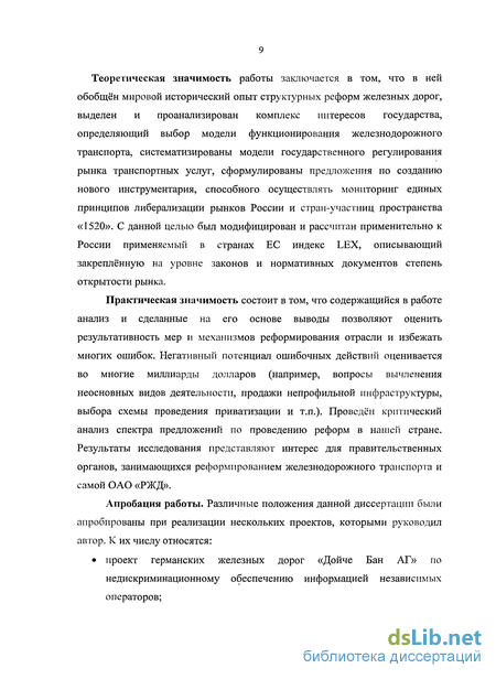 Теоретическая значимость работы заключается в том, что в ней обобщён мировой исторический опыт структурных реформ железных дорог, выделен и проанализирован комплекс интересов государства, определяющий выбор модели функционирования железнодорожного транспорта, систематизированы модели государственного регулирования рынка транспортных услуг, сформулированы предложения по созданию нового инструментария, способного осуществлять мониторинг единых принципов либерализации рынков России и стран-участниц пространства «1520». С данной целью был модифицирован и рассчитан применительно к России применяемый в странах ЕС индекс LEX, описывающий закреплённую на уровне законов и нормативных документов степень открытости рынка.
