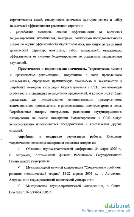 Практическая и теоретическая значимость. Теоретические выводы и практические рекомендации, полученные в ходе проведенного исследования, определяют практическую значимость и заключаются в разработке методики интеграции бюджетирования с ССП, учитывающей особенности и специфику исследуемых предприятий, и которая может быть предложена для использования муниципальными предприятиями, занимающимися производством и распределением электроэнергии и воды. Разработанные автором инструменты реализации внутрифирменного планирования на основе интеграции бюджетирования и ССП могут непосредственно использоваться предприятиями и комплексами других отраслей.