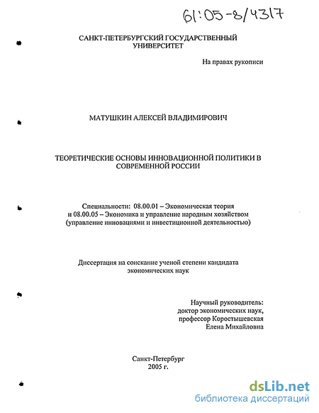 • организационно-экономические и правовые основы инновационной политики явились предметом исследования в трудах Н.В. Бекетова, В.В. Иванова, И.Г. Дежиной, В.В. Новохатского, В.Г. Цогоева и других исследователей.